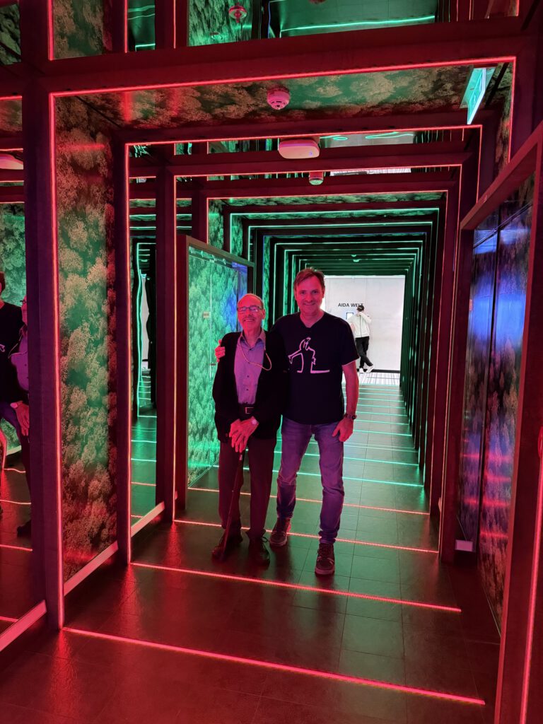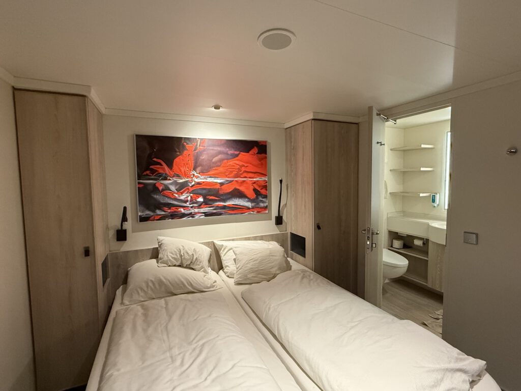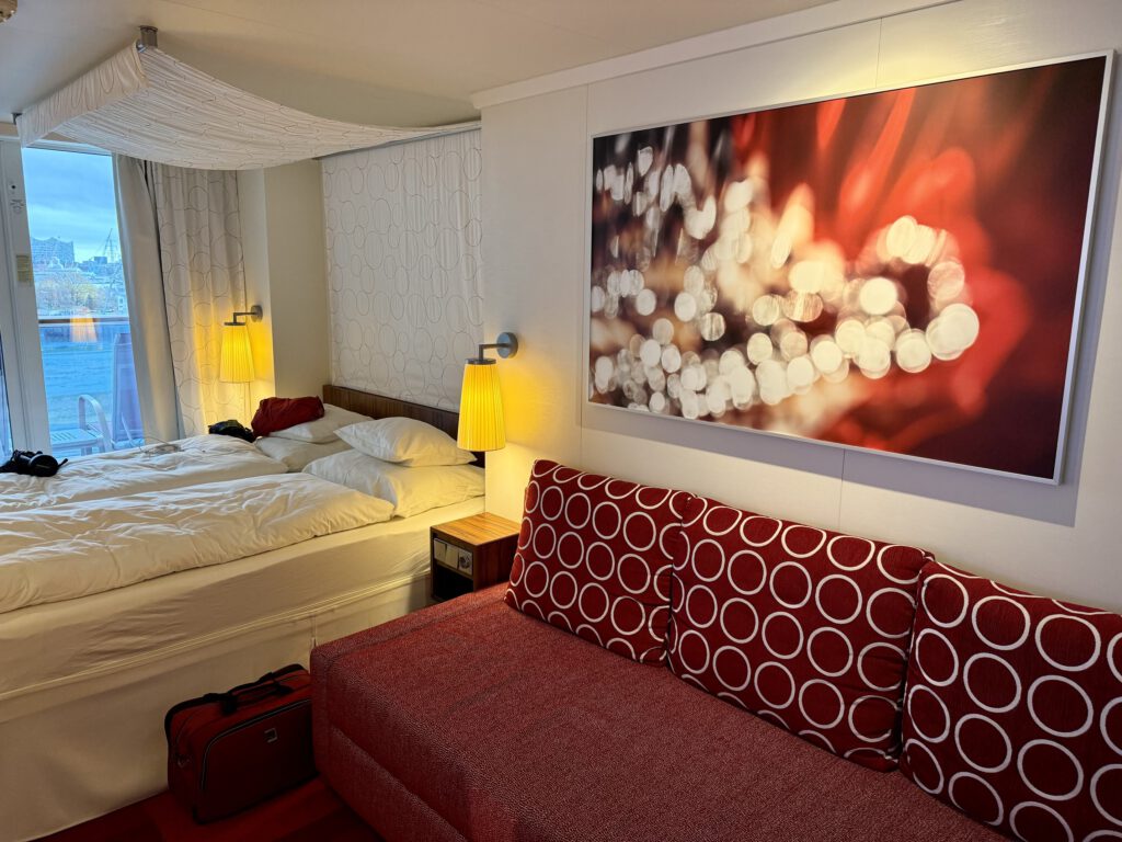 Unsere Kabine war schon fertig, wir schmissen alle Taschen bei uns rein und schauten das Sicherheitsvideo gemeinsam. Kabine original wie 2024, dieses Mal Ausblick auf Hamburg.