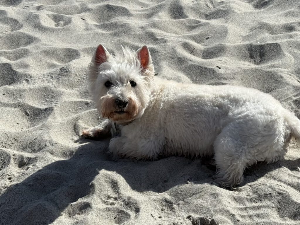 Wir genossen Sonne, Strand, Strandkorb und schauten verliebt auf unseren buddelnden Hund.