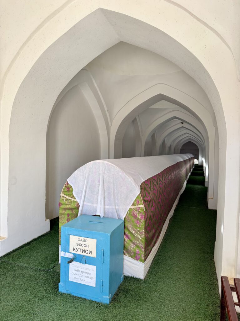 Auch in den Moscheen findet die Zweckentfremdung statt, was uns weltlichen Touris allerdings entgegenkam. Zum Teil befinden sich Museen in diesen oder auch Andenkenläden neben der Gebetsnische. Das könnte sich in den nächsten Jahren ändern, da auch in Usbekistan die Umkehr zur Religion stattfindet.