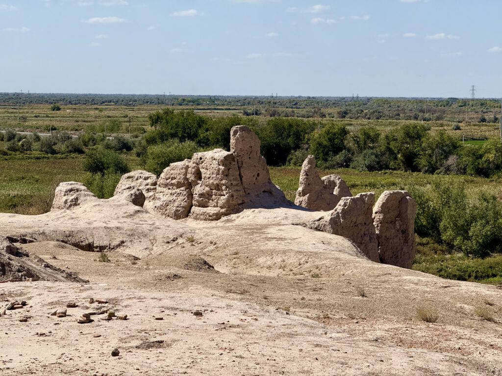 Die Giaur Kala befindet sich im Vierländereck der Seidenstraße unweit von Kasachstan, Turkmenistan ( keine 5 Minuten entfernt) Usbekistan und im weiteren Sinne Iran, gleich hinter Turkmenistan…so die Ausführung unseres Fahrers. Googlelt man, bekommt man folgende Auskunft: Giaur Kala ist die Burg der Ungläubigen, was auf den Brauch der Zorozastrier zuruckzuführen ist (ich erinnere an den Tempel in Yazd) . Sie lag an einem wichtigen Verkehrsknotenpunkt der Seidenstraße und war deshalb strategisch wichtig. Erbaut im 4 Jh n. Chr. bekam sie im 16Jh. ihren Namen von den Arabern, die viel, viel später das Land eroberten und bemerkten das alle Einwohner der Lehre Zarathustas angehörten.