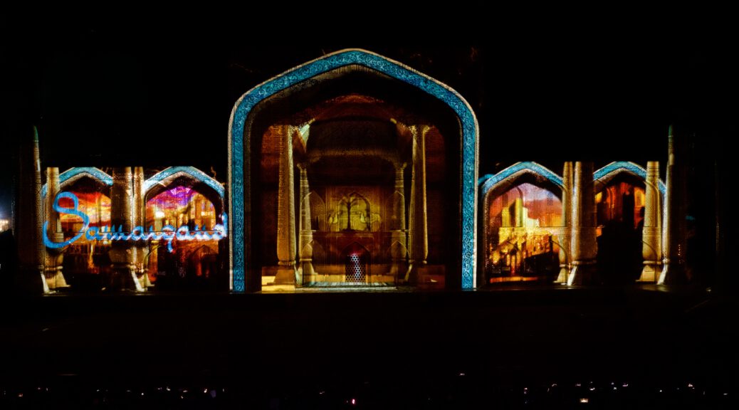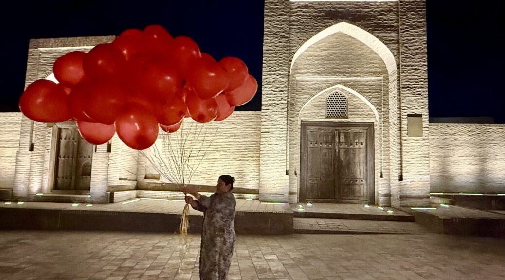 Uns zogs weiter über den Toqi Sarrofon Basar, der Karavanserei zur Mag‘ oki Moschee…..doch was ist eigentlich in Buchara los? Was machen Stoffdrachen vor dem Markt? Warum ist die Karavanserei mit einem bunten Boden ausgelegt? Erleuchtung, es ist Bienale.
