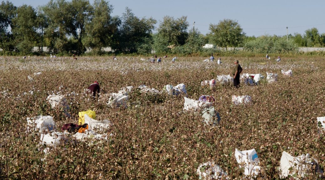 Wir hatten nicht mehr so viel übrig für verfallene Lehmbauten in glühender Nachmittagssonne, wir wollten zuruck nach Khvia. Und doch konnte uns Eines noch glücklich machen…Baumwollfelder kurz vor der Ernte bzw. mit laufender Ernte…der Ursprung allen Übels und dennoch heute mit der größte Wirtschaftszweig des Landes.