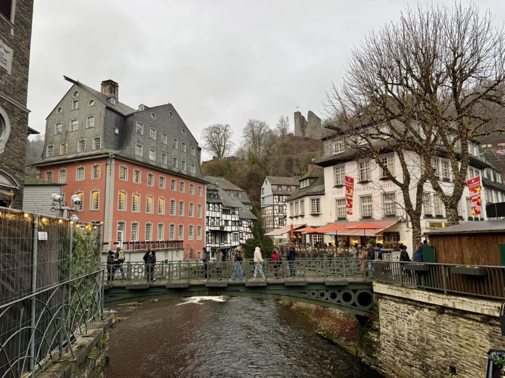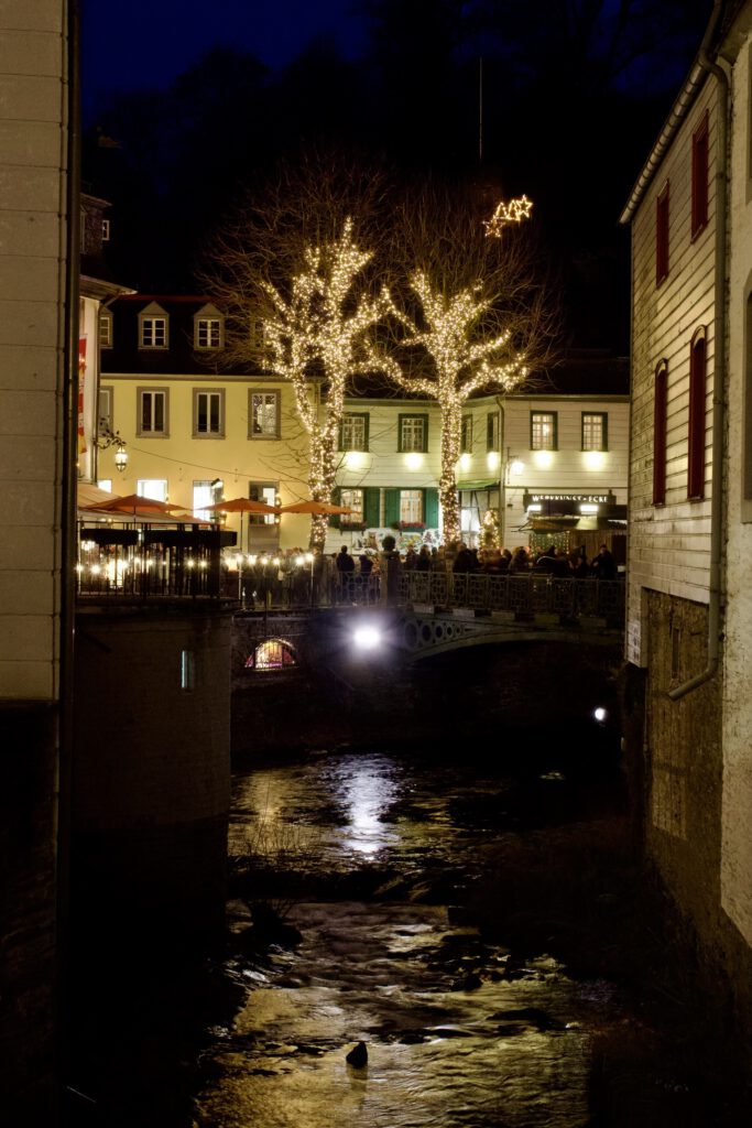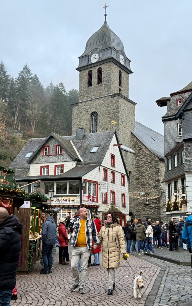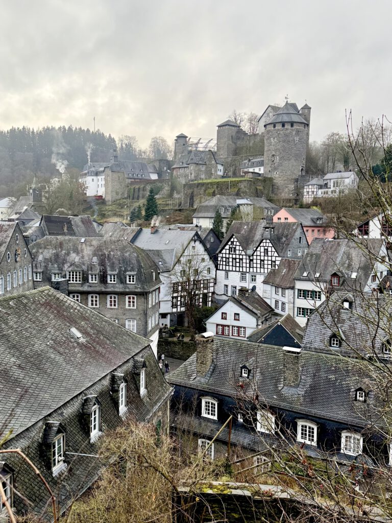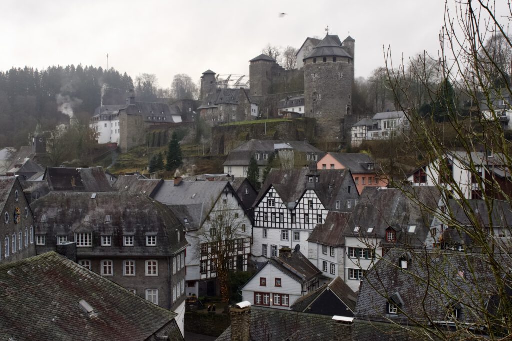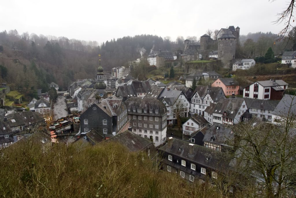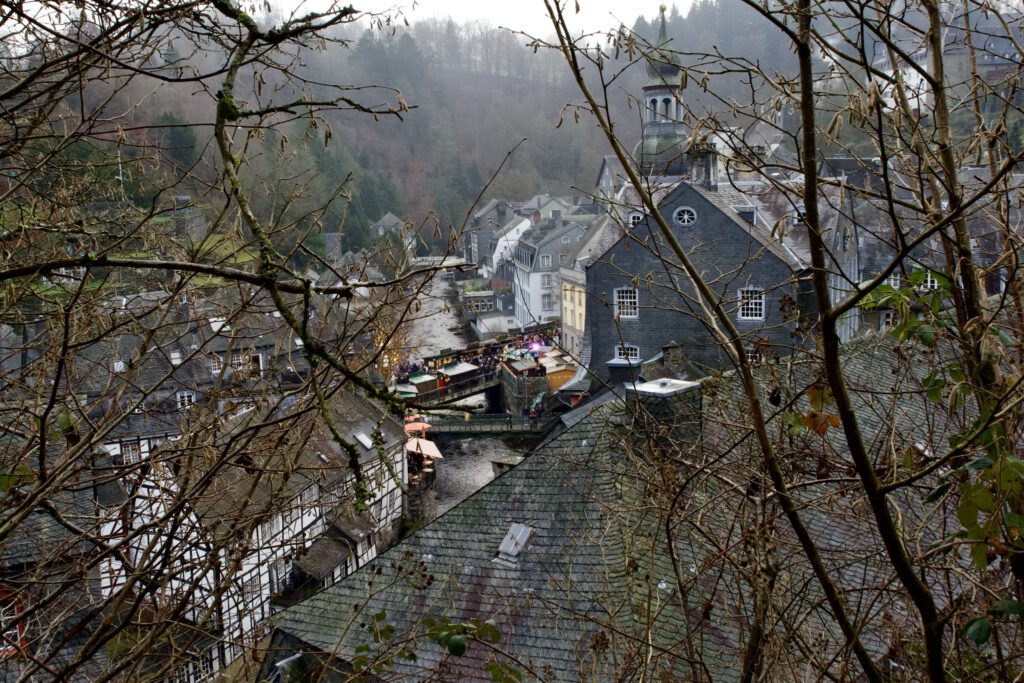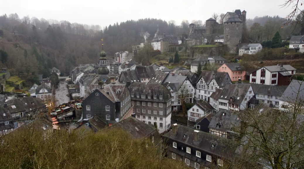 Monschau hieß bis 1918 Montjoie und wurde durch den Kaiser Wilhelm eingedeutscht, die belgische Grenze ist nicht weit. Die mittelalterliche Altstadt im Kessel des Flusses Rur ist für sein Fachwerk, den engen Straßen, tuffigen Hotels UND einem der schönsten Weihnachtsmärkte bekannt.