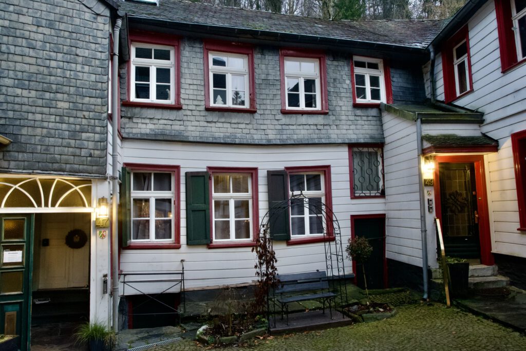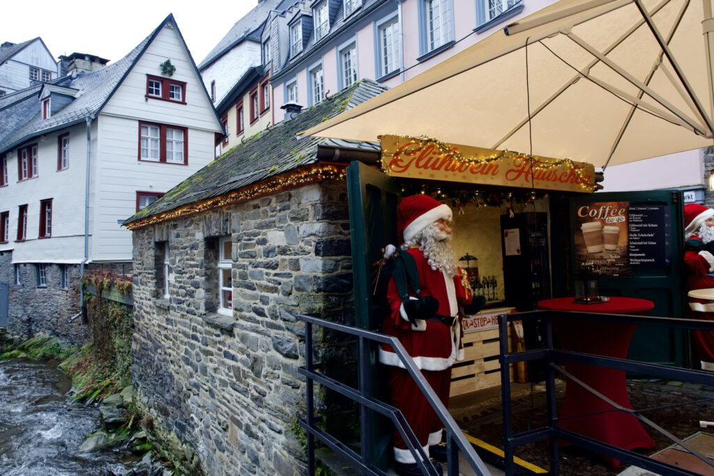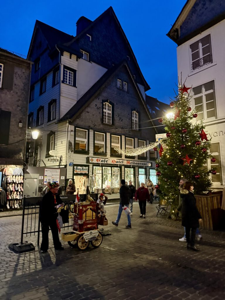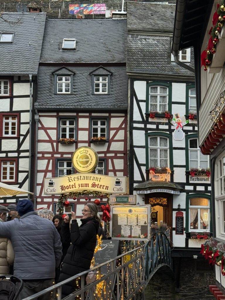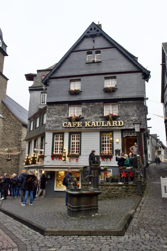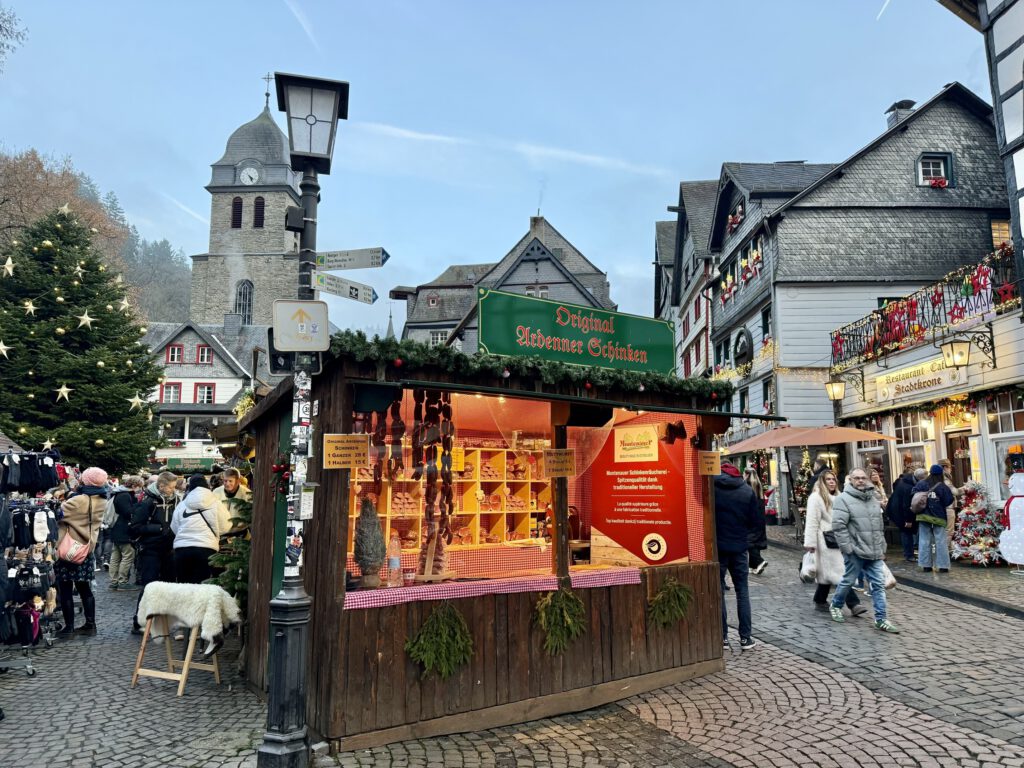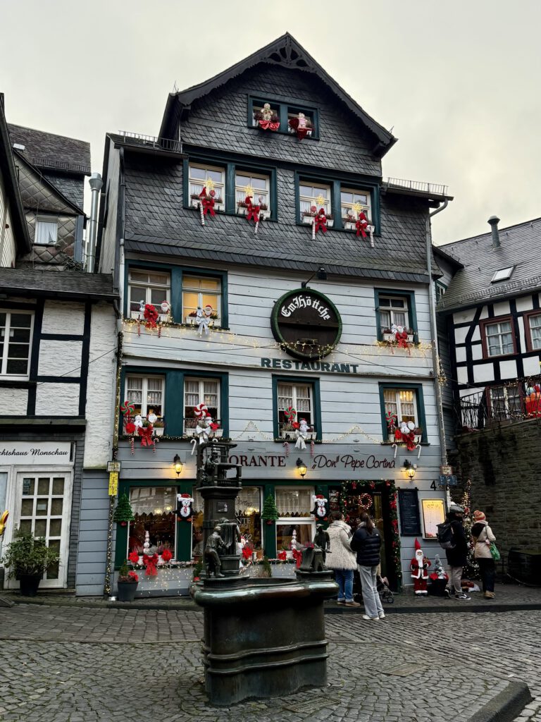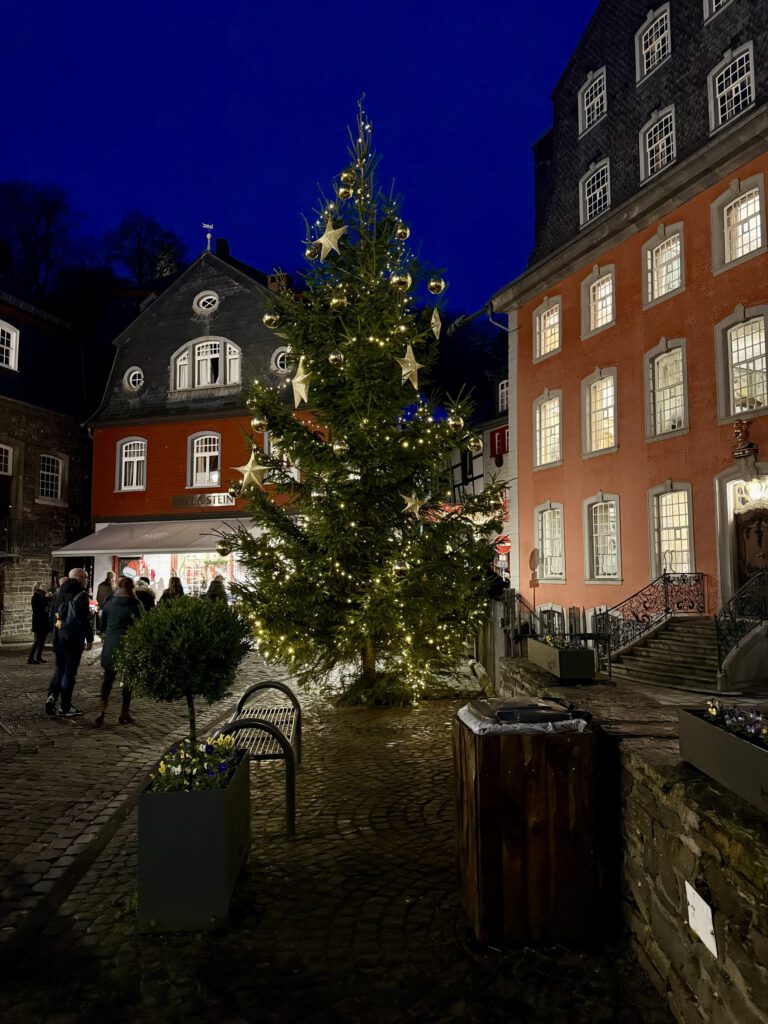 Monschau hieß bis 1918 Montjoie und wurde durch den Kaiser Wilhelm eingedeutscht, die belgische Grenze ist nicht weit. Die mittelalterliche Altstadt im Kessel des Flusses Rur ist für sein Fachwerk, den engen Straßen, tuffigen Hotels UND einem der schönsten Weihnachtsmärkte bekannt.