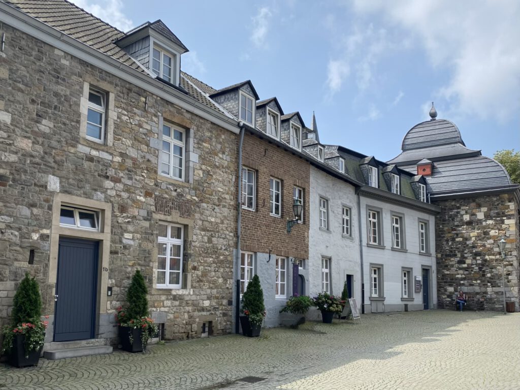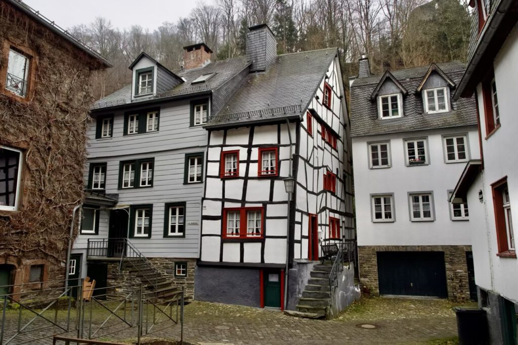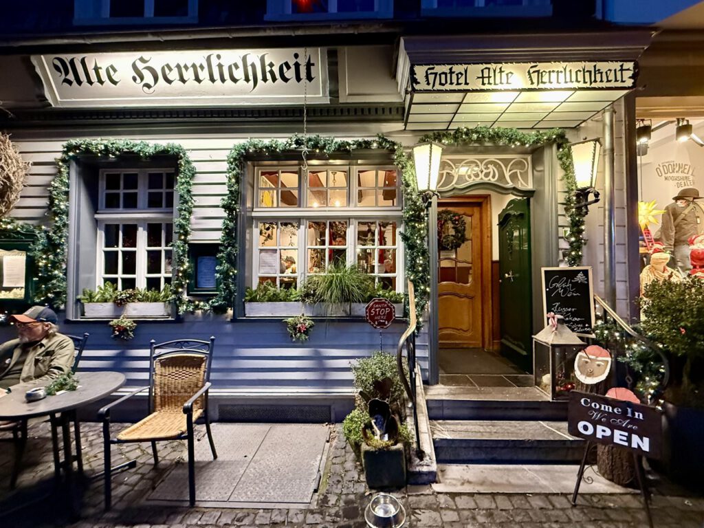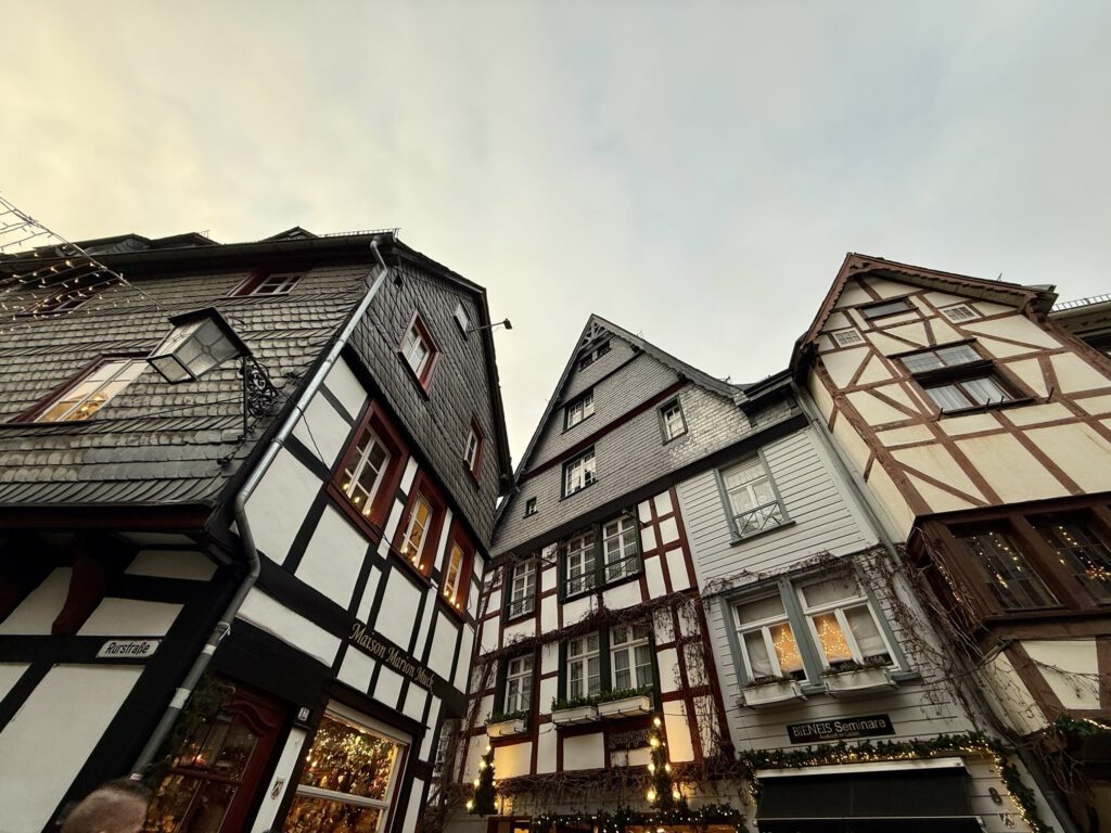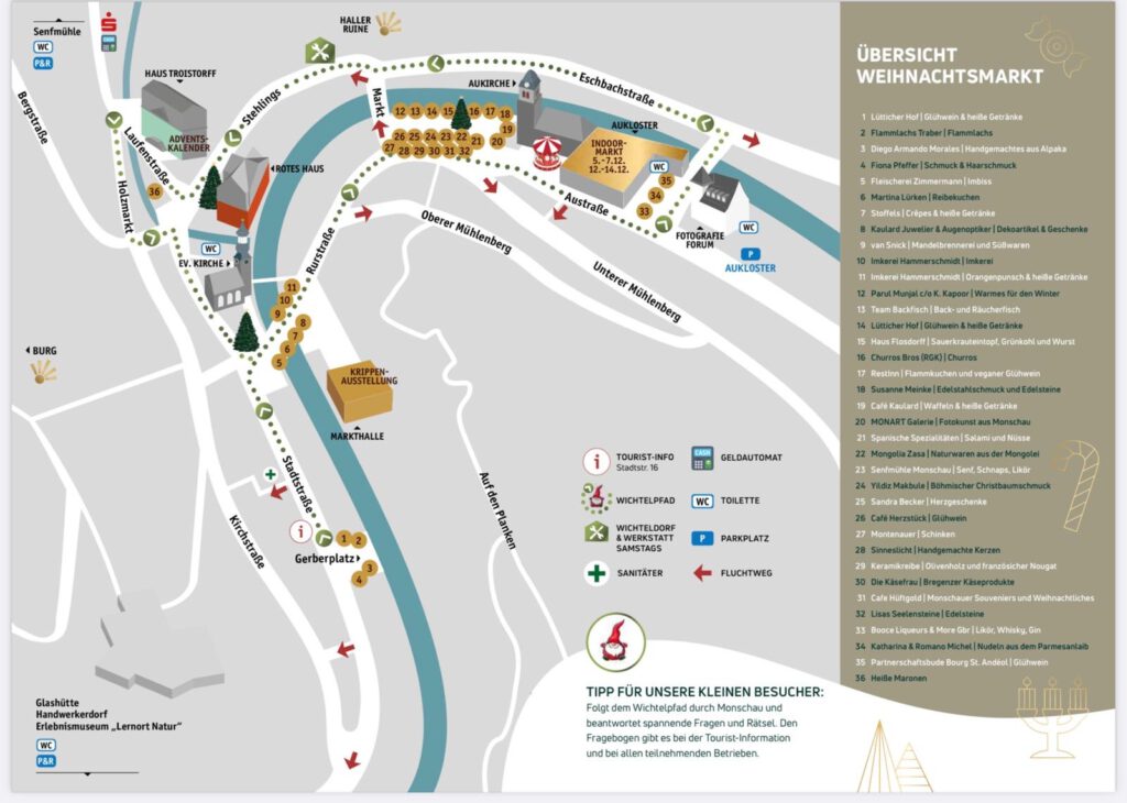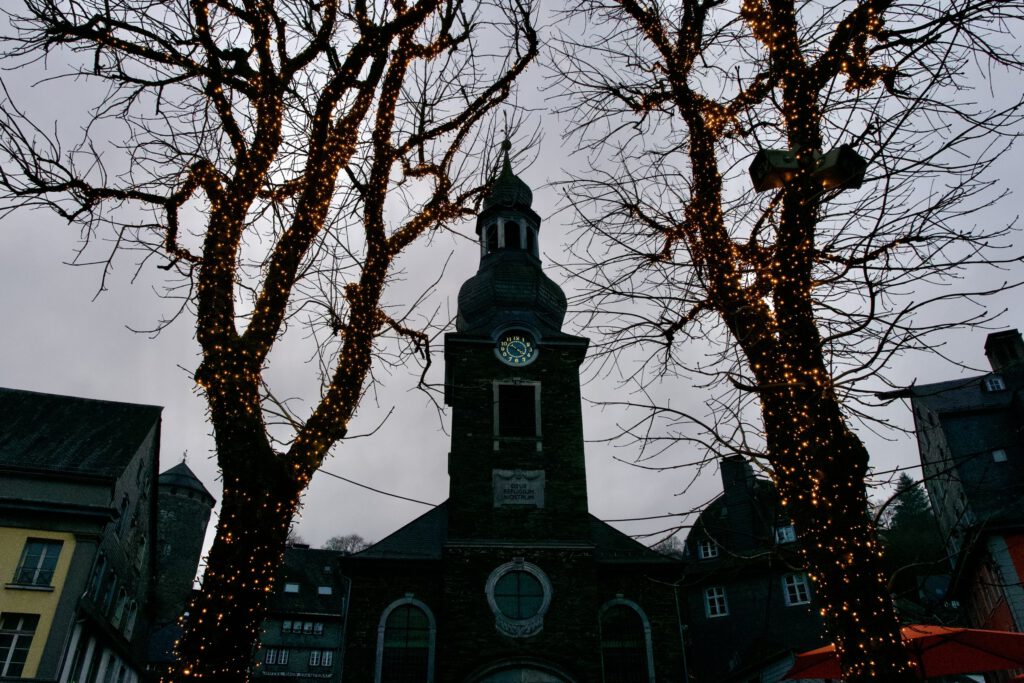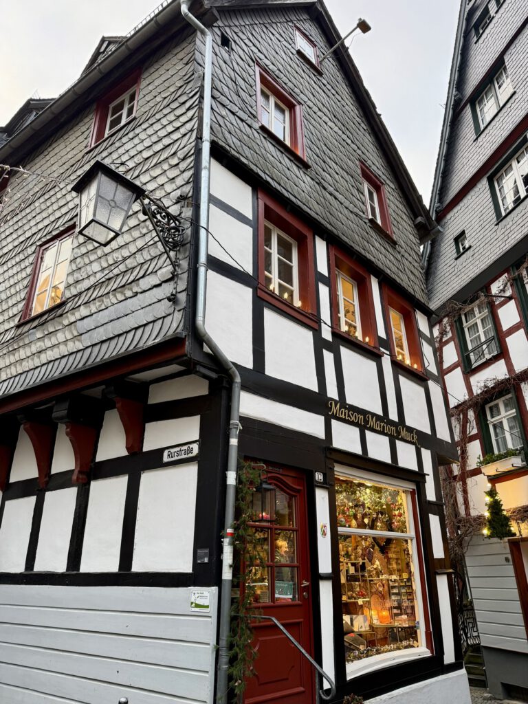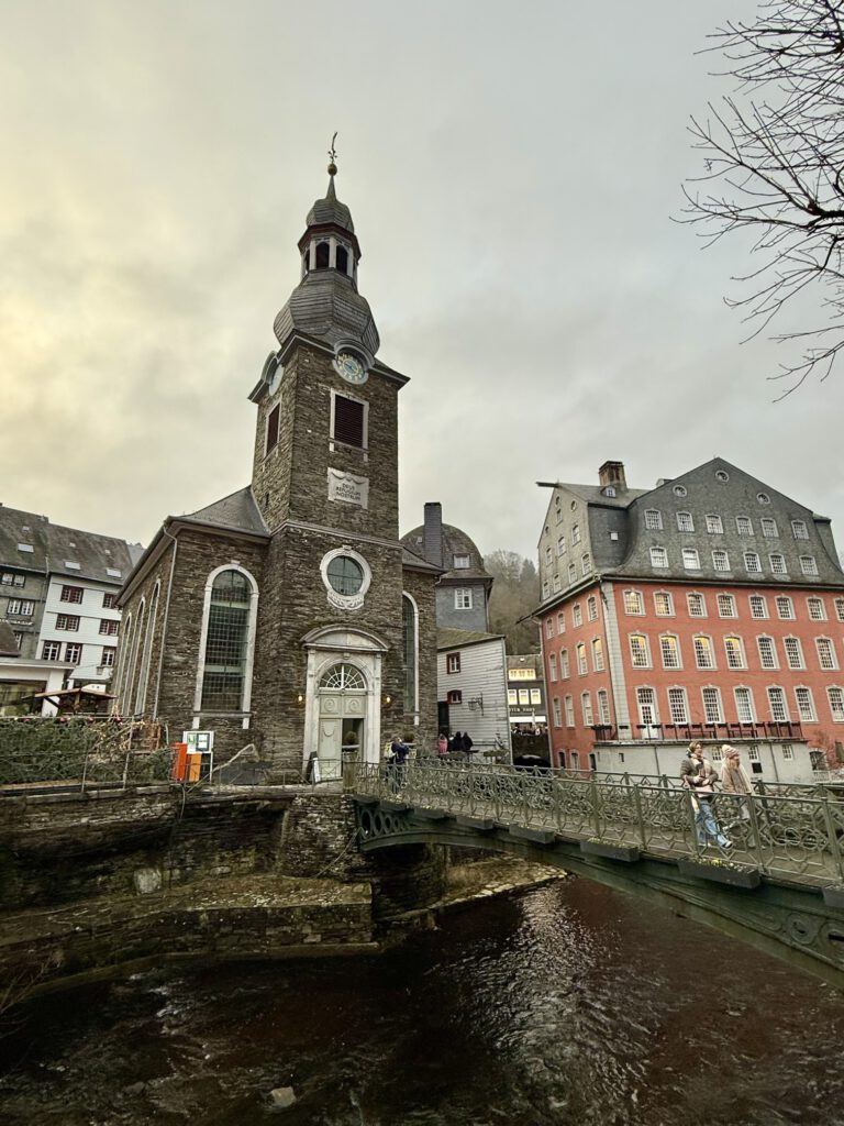 Monschau hieß bis 1918 Montjoie und wurde durch den Kaiser Wilhelm eingedeutscht, die belgische Grenze ist nicht weit. Die mittelalterliche Altstadt im Kessel des Flusses Rur ist für sein Fachwerk, den engen Straßen, tuffigen Hotels UND einem der schönsten Weihnachtsmärkte bekannt.