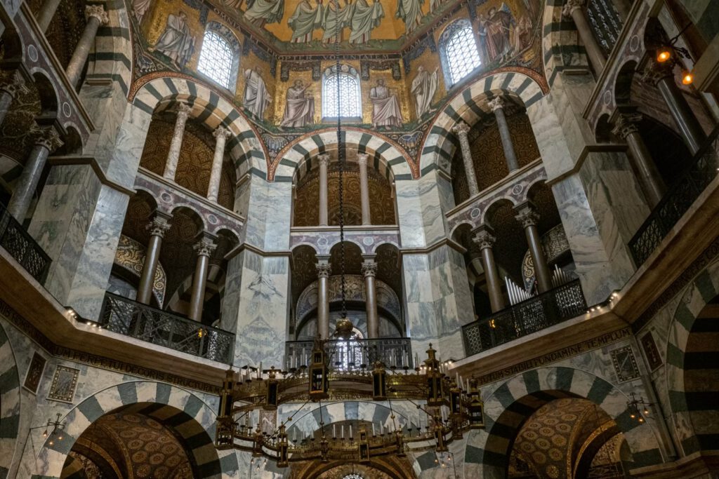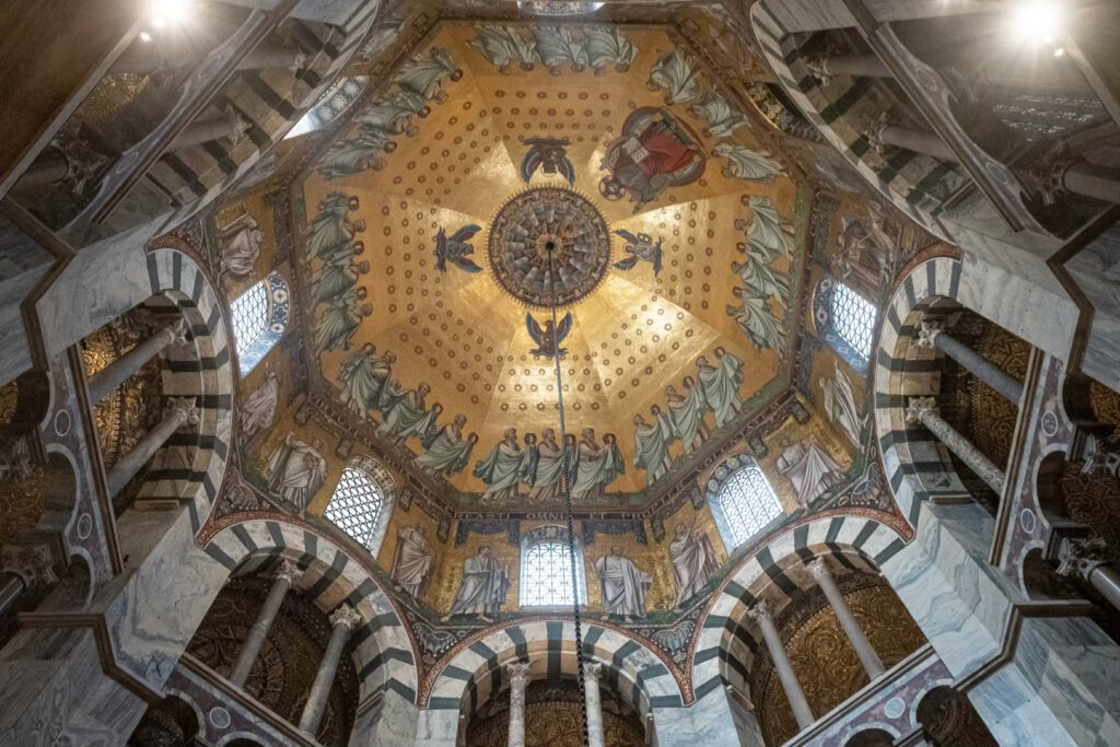Grundsteinlegung des Gotteshauses war 795, Weihung 1802. Mehrere Umbauten um das Oktogon, der karolingischen Kurkapelle wurden vorgenommen. Mich hat der Dom überraschenderweise sehr beeindruckt, insbesondere die byzantinischen und mediterranen Einflüsse machen das Ensemble zu etwas ganz Besonderen.