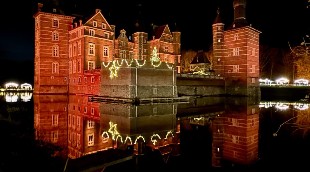 Außerhalb von Eschweiler, bereits zu Düren gehörend, steht ein bezauberndes Privatschloss namens Merode. Es wird, lt. www. immer noch privat bewohnt, immerhin für Veranstaltungen geöffnet und beherbergt wohl einen der schönsten Weihnachtsmärkte, die ich jemals kennenlernen durfte. Doch das Ganze hat auch seinen Preis: https://www.weihnachtsmarkt-merode.de