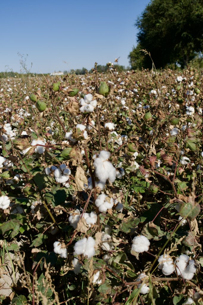 Baumwolle: Desaster und einer der wichtigsten Wirtschaftszweige im Land. Die Qualität ist gut, das merkt man auch beim Kauf von T- Shirts. Desaster aufgrund der Aralseekatastrophe und der mieserablen Wasserpolitik der Sowjets.  Immerhin, Kinderarbeit ist verboten, auch Studierende müssen nicht mehr auf die Felder. Dies war unter den Sowjets noch normales Verfahren. Mehr dazu im passenden Aralseebeitrag: