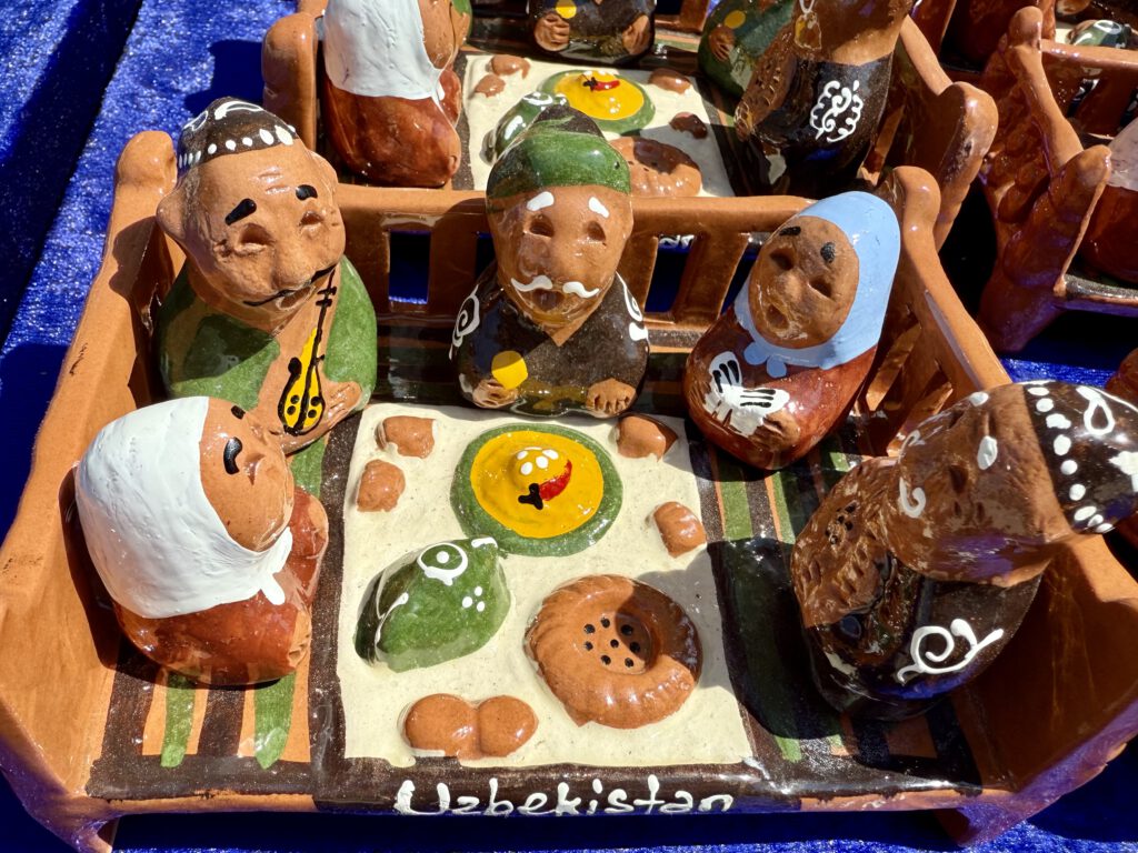 Souveniere: Man kann gut in Usbekistan shoppen, Keramik, Kleidung, Kunsthandwerk, Gewürze, Brotstempel, Papierwaren….die Geschäfte sind voll, die Preise fair