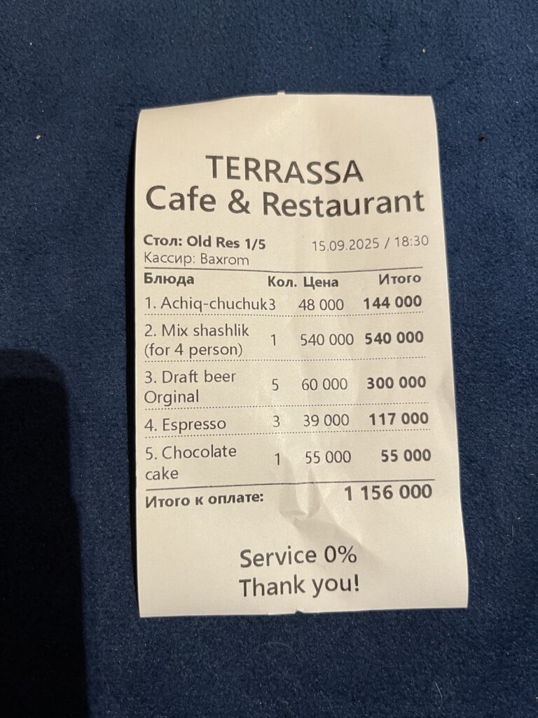 Die hier gezeigte Rechnung ist eine Luxusrechnung…..leicht erhöhte Preise in Khiva UND wir ließen es krachen.