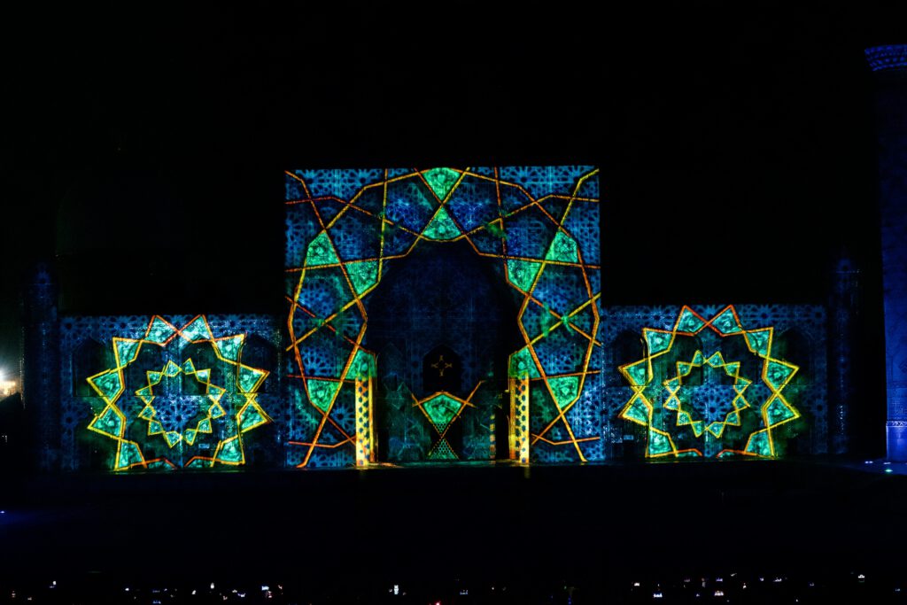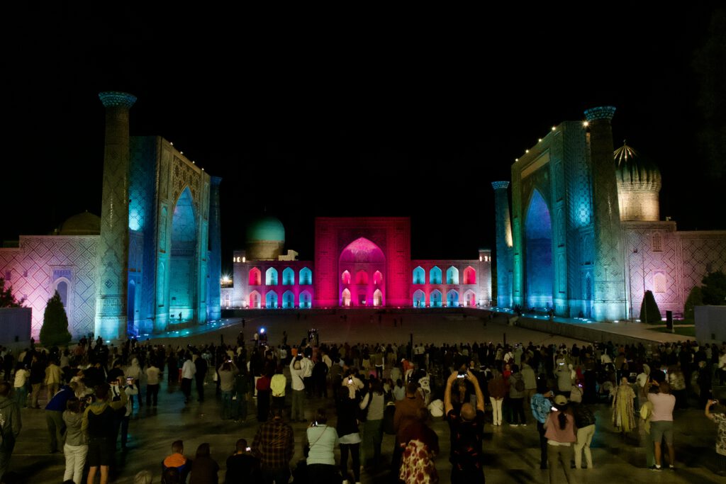 Registan: Die Lightshow auf dem Registan in Samarkan begann im September 2025 grundsätzlich immer um 20:30 und besteht aus zwei Teilen. Erst eine bunter Lichtershow, dann eine sagenhafte Lasershow. Diese ist unentgeltlich und sehr empfehlenswert.