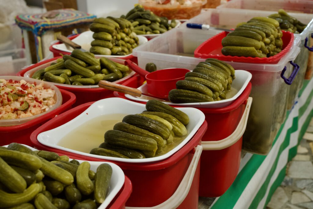Salate: Wow, das können die Usbeken. Die Salate schmecken ALLE grandios, egal ob Tomate, Kohl oder Glasnudelsalat. Wir waren immer begeistert. Sicherlich ist hier auch der Einfluss aus dem russischen Norden ersichtlich. Selbst die eingelegten Gurken haben geschmeckt.